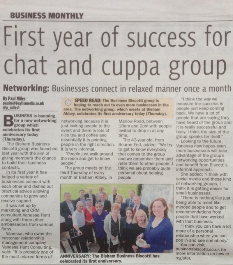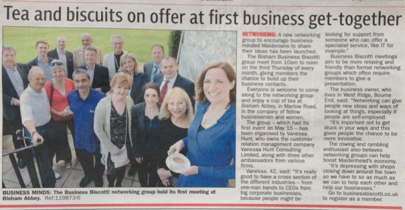 Vanessa Hunt Consulting co-sponsors the Business Biscotti group held at Bisham Abbey with Plum Design & Publishing. We celebrated our 1st Birthday on 21st May 2015. We've tried to create an informal, personal atmosphere for professional networking with fellow Ambassadors Nick Rose and Lynn Hart. Come along on the 3rd Thursday of the month, from 10am-12pm.
